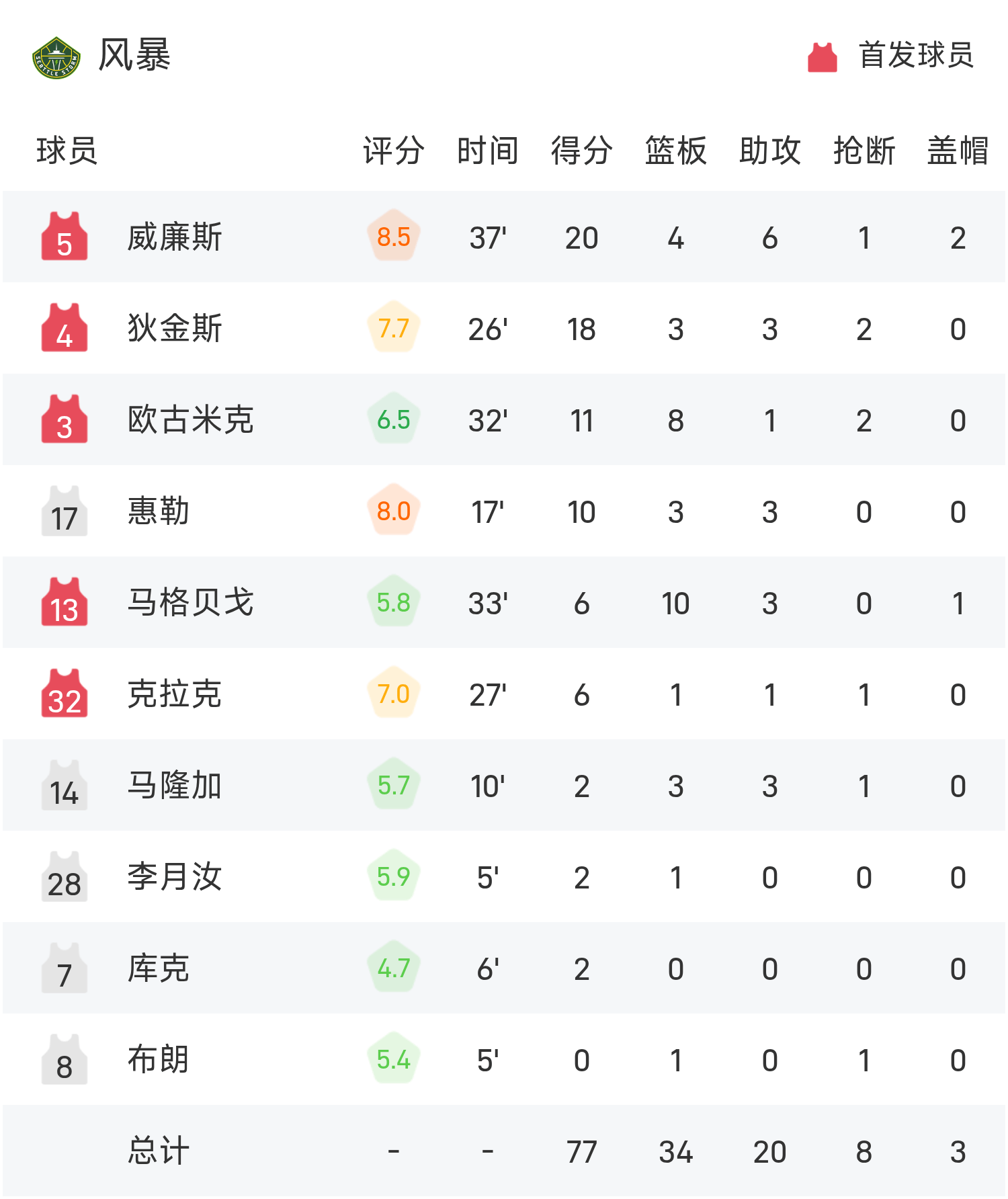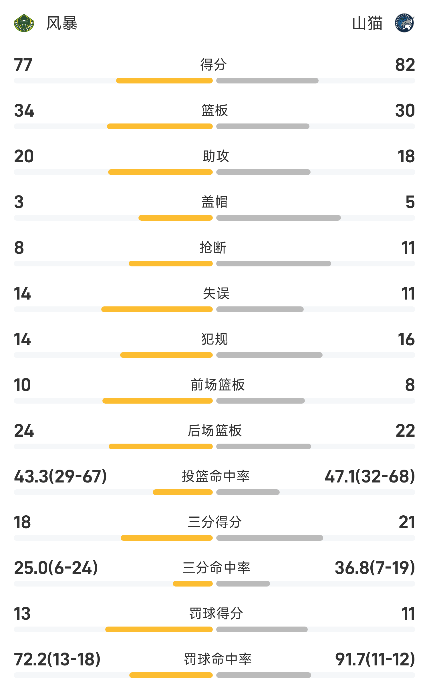🏀WNBA战报:威廉姆斯23分,威廉斯20分6助,山猫82-77击败风暴